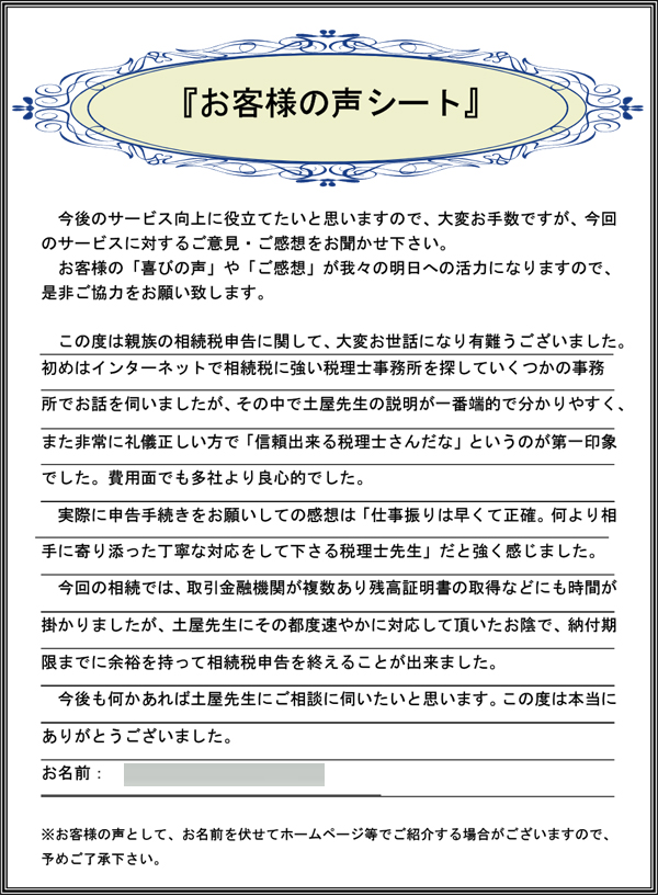 また相続税申告はその分野にくわしい税理士さんに依頼したかったのでその点でも土屋先生は頼りになりました。
