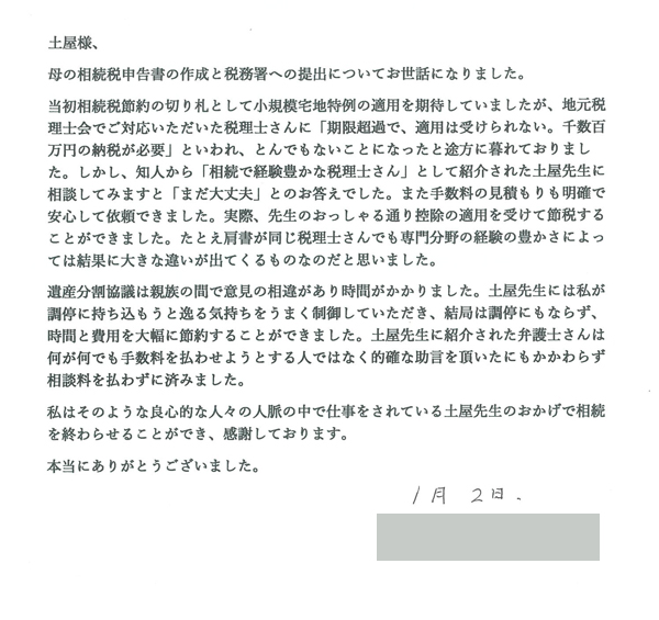土屋様、母の相続税申告書の作成と税務署への提出についてお世話になりました。当初相続税節約の切り札として小規模宅地特例の適用を期待していましたが、地元税理士会でご対応いただいた税理士さんに「期限超過で、適用は受けられない。千数百万円の納税が必要」といわれ、とんでもないことになったと途方に暮れておりました。