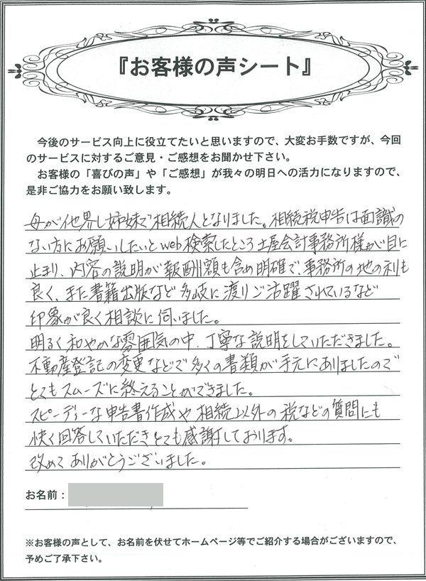 母が他界し姉妹で相続人となりました。相続税申告は面識のない方にお願いしたいとweb検索したところ土屋会計事務所様が目に止まり、内容の説明が報酬額も含め明確で、事務所の地の利も良く、また書籍出版など多岐に渡りご活躍されているなど印象が良く相談に伺いました。