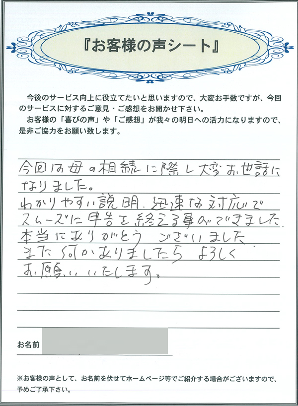 スピーディーな申告書作成や相続以外の税などの質問にも快く回答していただきとても感謝しております。改めてありがとうございました。
