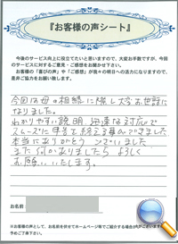 明るく和やかな雰囲気の中、丁寧な説明をしていただきました。不動産登記の変更などで多くの書類が手元にありましたのでとてもスムーズに終えることができました。